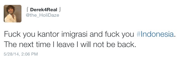 To answer the questions I have been receiving from friends, Twitter followers, colleagues, and journalists who have been trying to contact me to hear my side of the story, I hereby state that I DID NOT send his insulting tweet to the Immigrations Office, nor did I make any attempt to get this issue noticed by the authorities. The only tweet I forwarded to @imigrasiRI before the detention contains a conversation between Derek and a few friends who pointed out that he has been staying in Indonesia and working here using a tourist’s visa is illegal and against the law, NOT the tweet in which Derek insulted the Immigrations Office which caused him to be detained and (soon be) deported.