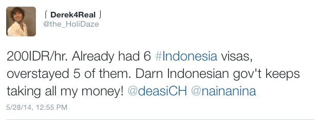 A week after I flew to Jakarta, while I was in preparation of launching my new book, Derek got in trouble with the Immigrations Office. He overstayed his visa and was obliged to pay the fine. The Immigrations Office also refused to renew his visa as per the Indonesian immigration law. Do note that Derek has been working illegally using a tourist’s visa. In addition he has also overstayed his visa past its due date already 5 times. Despite the Immigrations Office’s generosity and patience with his previous offenses, Derek decided to lash out on the Immigrations Office and Indonesia in general; this was done on his Twitter account. He accused the Indonesian government of taking all of his money.
